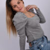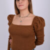 Μπλούζα Πλεκτή Μουσταρδί σε Στενή Γραμμή με Ίσια Πλέξη, Τετράγωνη Λαιμόκοψη και Φουσκωτά Μανίκια.
